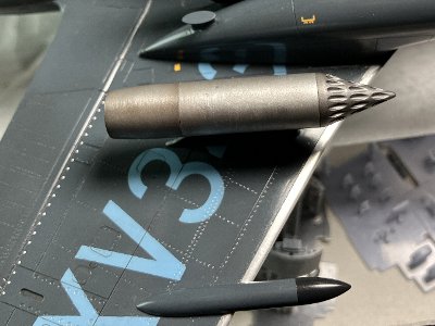 ![]() ロケットポッドも接着。ポッドは、隣のRWRフェアリングより軸線が上を向くが、実機写真を見ると、違っていて正解。 |