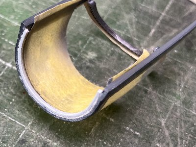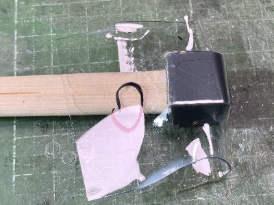 ![]() 凸リベットに馴染ませようと、上から押さえたときに手が滑って、下側のフィンを折ってしまう。画像は再接着したところ。 |