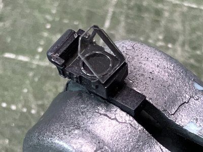 ![]() ガンサイトに0.2mmプラバンのガラスを取り付ける。フチを薄めたグレイで塗ると白浮きしない。 |