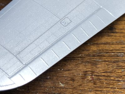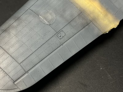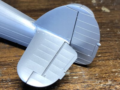 では、放置前の書き残しから。エルロンのリブは通常ならインレタで再現するが、尾翼の表現に近づけるため、ナイフで切れ目を入れる方式にする。両脇のメクレが凸リブに見えてくれる。中心の細いスジはサフで埋める。 |