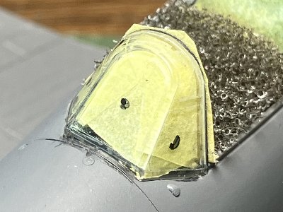 ![]() 風防のマスキングも終了。一部窓枠モールドが不明瞭なところは、カッティングシートの細切りをガイドにする。 |
