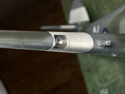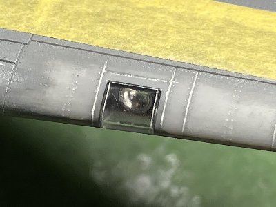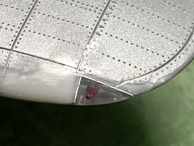 ![]() 翼端灯も同様に光硬化瞬間で接着し、整形、スジボリ、研磨する。クリアパーツ側の断面を銀で塗っておく。 |