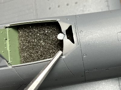 ![]() プロペラブレードは切り飛ばし、スピナを整形する。小穴に真鍮線が入りづらいので、ランナーで漏斗状の受けをつける。 |