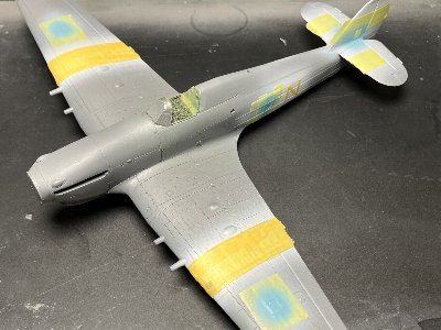![]() ダルブルーをマスクしたら、迷彩塗装に入る。発色のため、白と青の上に再度サフを吹く。 |