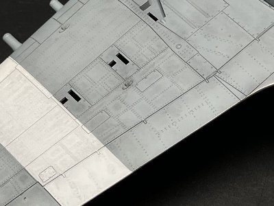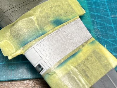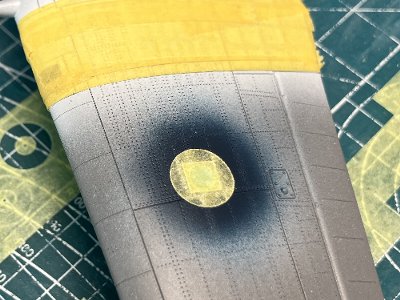 ![]() ところが凸リベットが邪魔で上手く拭き取れない。再度上から白(今度は黒10%混)を吹く。そのためのマスキング。 |
