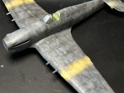 主翼前縁の上下面の塗り分けが違っていて修正する。主翼の最前端にしてたが、もう少し下に回り込むのが正解のようだ。筆でざっと修正してからエアブラシで筆痕を消す。全てエアブラシだとボケ足が広くなり過ぎる。 |
