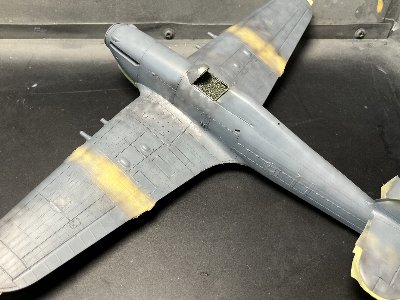 サンディングで消えたカウルのファスナは、#12と#3のたまぐりで再生。スピナ直後のオイル除けは、L字断面をしていて、漏れた油を受けるようになっている。ノミなどでフチを残して削る。ブリスターは、少し削って低くするといいかも。 画像はないけど、機首のトロピカルフィルターとラジエータも接着。これで、基本外形の組み立ては終了。あとはリベットの再生/追加とキズ等の修正だ。