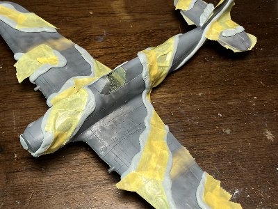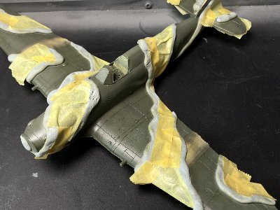![]() エルロンの凹みは、タミヤパテで平らにする。リブの再現方法は後で考える。 |
