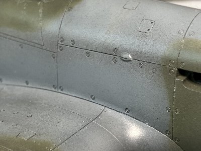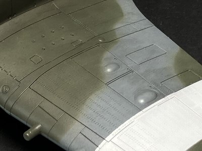 バリバリの凸リベットのキットって初めて作るから、勝手が分からない。ウェザマスの拭き取りにこれほど難儀するとは。洗剤に歯ブラシでゴシゴシやっても落ちないのだ。白帯だけでなく、迷彩部分も迷彩色を薄く上吹きする。 さらに、迷彩の境界の不具合を吹き直したり、基本色+ダークグレイ、あるいは基本色+ライトグレイで、グラデーションを加えたりとコテコテ。 |