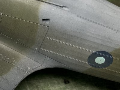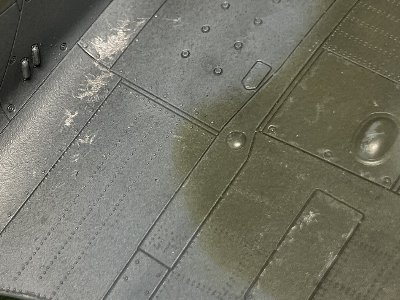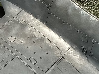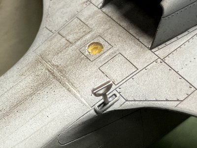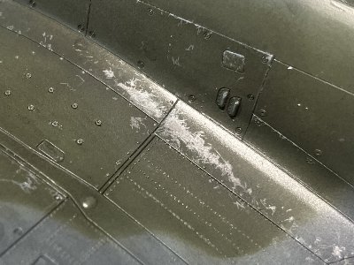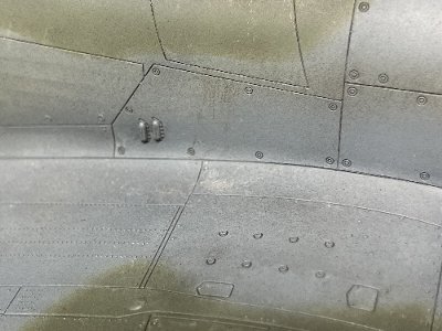 ![]() 翼上面は強めに汚す。付け根のハゲチョロは、銀はがしと色鉛筆。凸リベットに軽くペーパーかけたり。一方で後部胴体上面などは、ほとんど汚さない。このメリハリが大事(だと私は思う)。 |