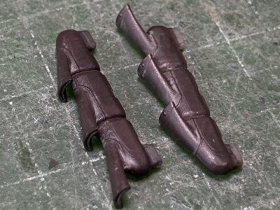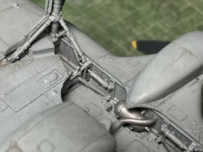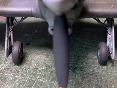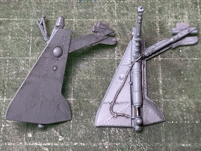 ![]() 脚カバーと脚の接着面を少し削る(後述)。ブレーキラインを追加し下面色で塗装。オレオにミラーフィニッシュ。 |