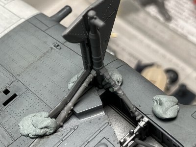 ![]() 脚回りもキットパーツ。脚柱と後方斜めロッドを立てた状態で接着(翼には仮り止め)。そこにカバーを接着する順序をオススメ。 |