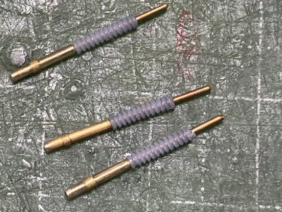 ![]() 銃身は1.0mm真鍮パイプ。1.2mm真鍮パイプの輪切りを被せる。後半に0.6mm真鍮線を刺す。ネジ状のスリーブは自作3DP。 |
