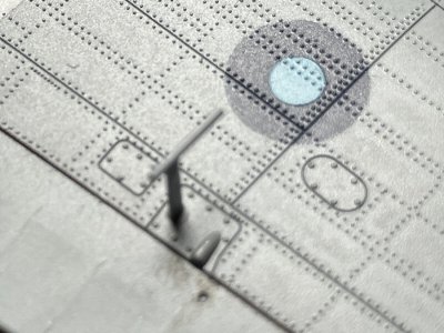 最初は不要なモデルで練習する。プラペーパーは0.1mmか0.14mm、接着剤はタミヤの緑フタ(黄緑でない方)。カッターマットの上にプラペーパーを置き、Drリベットの針先をくるっと回してくり抜く。そのまま針先を接着剤にちょんと浸し、モデルの面に垂直に置き、ピストンを押す。 切り抜いて、貼るだけなら意外と簡単。難しいのは針先を正しい位置に合わせること。模型を左手で持ち、右手で針先の位置を決めると、ピストンを押すのに手がもう一つ要る。したがって、模型は固定しておく必要がある。一列に揃えるのが高難易度。一応、ガイドテープを貼るが、それでも位置が乱れる。あと、大きさにもバラツキがでる。練習あるのみだな。 といいつつ、練習もそこそこに本番。アルマのキットのラジエータは、抜きの都合で凸リベットが再現されていない。とりあえずケガキ針でつついてあるが、ここにDrリベットを注射してみよう。 |