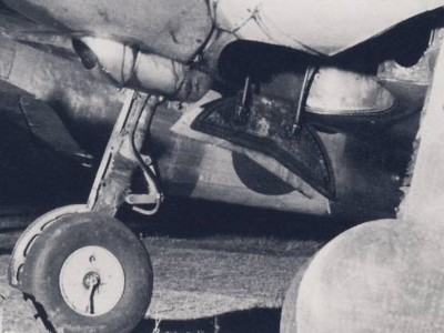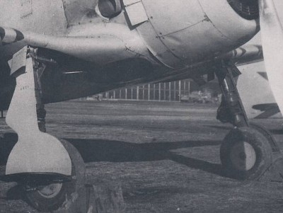 ![]() U型丙の脚回り。下からの照明により明瞭に分かる。三日月形の車輪カバーは暗色(青竹?)、脚カバー内側は明色(無塗装)なのが一目瞭然。収容部は暗色っぽいが、部分的に無塗装部もありか? |