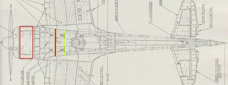 上に示した図面は、防火壁で1,050mmにするため、太い機首から防火壁の間で、胴体幅をかなり絞っている。そのため、前述のカウリングとエンジンとの間の「隙間」がないのだ。これはどう見てもおかしい。さらに実機を上から撮影した写真を見ると、図面のように顕著には胴体が「くびれ」ていない。 そこで下左画像をもとに防火壁の実寸を算出する。取説の主翼平面図などから、左右の機銃付近のパネルラインの間隔の実寸値は、多少の誤差はあったとしても既知。あとは比例計算だ。そうして求めた防火壁の幅は1,300mm前後。とても1,050mmにはならない。やはり、図面が違っている。 また、図面では2番フレーム(上図面で黄色)のところで胴体平面形が屈曲するが、これが正しいかどうかが第2の命題。写真では3番フレームで曲がるように見えるものもある(はっきりとはしないが)。製造上の都合で考えれば、屈曲点にパネルラインがあった方が、外板の取り付け作業が簡単。で、パネルラインはというと、3番フレームにある。よって私の結論は3番フレーム。 以上を図示したのが、下右図の青ライン。この胴体幅(1/48実寸値)は、カウル最大幅=30mm前後、防火壁=27mm前後、3番フレーム=22mm前後となる。カウルとエンジンの隙間に注意。既存図面と比べればその差は実に5mm(片側2.5mmずつ)。これはすごい誤差だぞ。ちなみに、キットのアウトラインは、この青線と元図面の中間あたりにあり、キットも実機より2mmほど細いという結論になる。 |