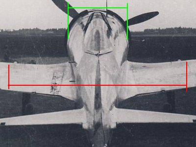 ![]() この写真で、防火壁の幅(緑)と左右の翼機銃パネル間隔(赤)との比率で防火壁の幅を算出する。結果は図面の1,050mmにはならない。なお、算出にあたっては、遠近法の誤差を排除するため、防火壁と同じ距離のところで比較することが重要。 |