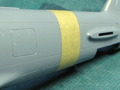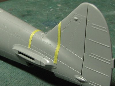 新キットで気になるのが、垂直尾翼付近の胴体断面形である。キットは胴体から延びている部分の肩が張っていて、垂直安定板にくびれがついているようになっているが、実機ではもっとなだらか。実機では水平尾翼付近の胴体上部断面形は、肩が削ぎ落とされオニギリ形断面となっていて、それがそのまま垂直安定板につながっている。70戦隊や47戦隊の部隊マークがこの部分にかかるので、意外と目立つと思うぞ。ここは裏打ちしてから肩の張り出しを削ってやるとよいだろう。 |