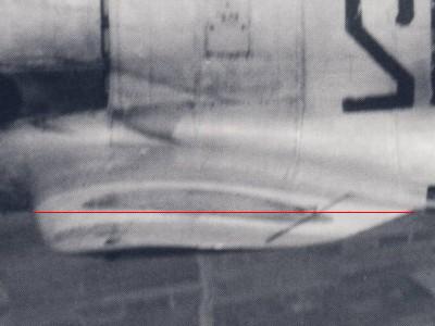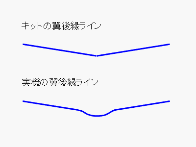 このサイトにある翼を後ろから撮影した画像では、翼後縁ラインは胴体下端ラインより上に位置する。キットではこれが一致しており、つまりキットは翼取り付け位置が若干低い。(下図参照) 主翼取り付け位置の間違いは、キットを真横から撮影し、これを実機のほぼ真横からの写真に重ね合わせると、キットは腹が垂れ下がり気味であることでも確認できる。 |