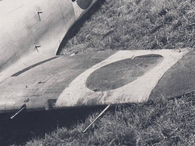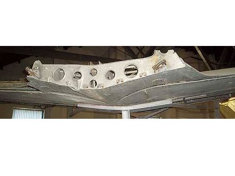 また、外翼部のパネルラインは、検証できる写真に乏しく確証はないのだが、私は下画像赤線のパネルライン「あり」とする。根拠は下画像。ただし、それが翼端まで続くのか、途中で終わるのか(例えばどこかのリブからリブ沿いに前方に折れ曲がるとか)については確証ない。まあしかし、この辺は彫るも埋めるも簡単だから、キットの問題点とは考えていない。モデラーが好きなように作ればよいのだ。 |