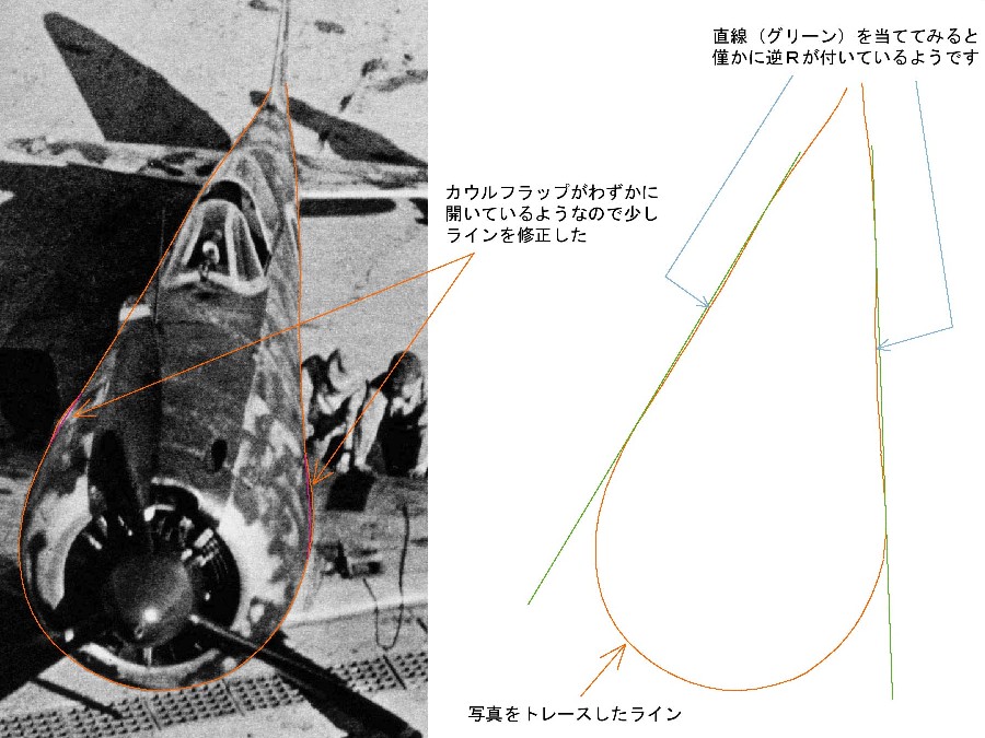 ![]() 青い四角がエンジン(エンジン先端とカウルのアクセルパネルのフレームとが一致する)。カウルフラップ前端付近ではエンジン直径より胴体がかなり太く、エンジンとカウルとの間に隙間ができる。 |