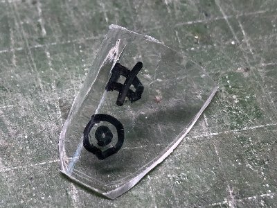![]() 使用するのは前回同様0.4mm透明プラバン。絞って厚さ1.2mm。回転ノコでざっと切り出す。5、6個絞っていいのを採用。 |