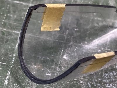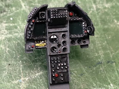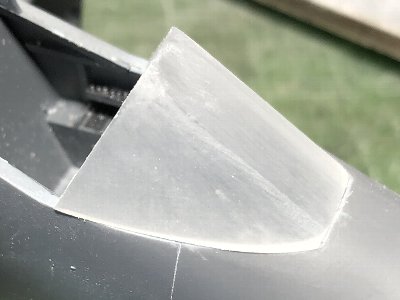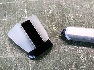 胴体と風防は、どちらも3Dの木型で、共通のデータを使っている。だから、合わせがよいのは当たり前なわけだが、それでも実際にピッタリ合うと嬉しいもの。手作りの木型ではこうはならない。というのも、同じデータとはいえ、ヒートプレスしたプラの厚さが違うのと、脱型後の「戻り」(プラの弾力で下端が0.3mmほど開く)があったりで、微小な誤差が出る。 そのため風防は0.2mmピッチで幅の異なる木型を用意し、何種類か絞り、最終的にピッタリ合うのを採用する。こういうことができるのが3Dの強み。ともあれ、最終的にこの1個を得るために絞った風防は20個くらい。歩留まり5%だよ。スライドキャノピも同様に絞ったけど、こちらは接着しないので、切り出し整形は後ほど。 その他補足。カセットコンロの火力は弱火。20秒で縮み始める程度に、ゆっくり加熱。計器盤のデカールはタミヤのシーハリアーから。プラパーツは使い物にならないが、これで元が取れたよ。グレアシールドは白30%のセミグロス黒。EDSGでドライブラシ。風防のフチは、まず内側のエッジを斜め45度に削る。その斜めの面の中央に三角刀で細い溝を彫ると、それが段差になる。あとはノミなどでフチを薄くしていく。