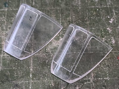![]() 新規パーツ出来上がり。コーナーのスジボリはエッチングテンプレート。奥が旧パーツ。透明度の差は歴然。 |