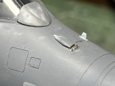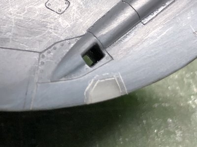 ![]() 補助インテイクの突起を伸ばしランナーで工作。こういうのは、長めに切って、貼ってから余分をカットする。 |