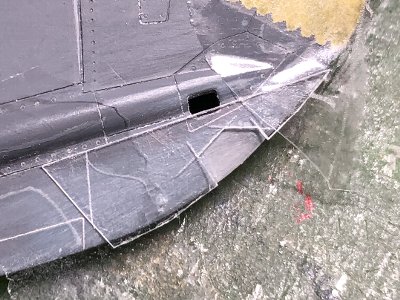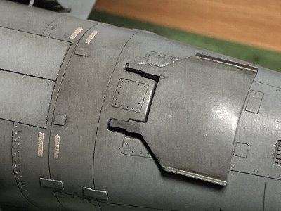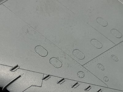 ![]() リベットや補強板など、ちょっとオーバー気味に造形する。バルジ上のパネルラインもばっちりだ(写真ではよく分からんが)。 |