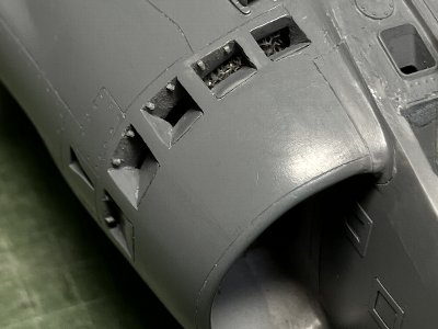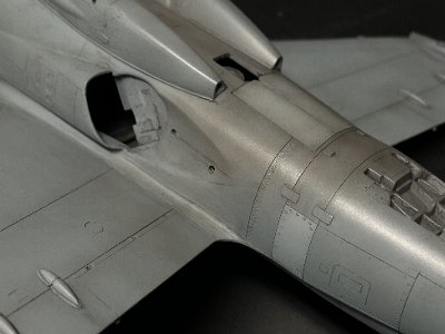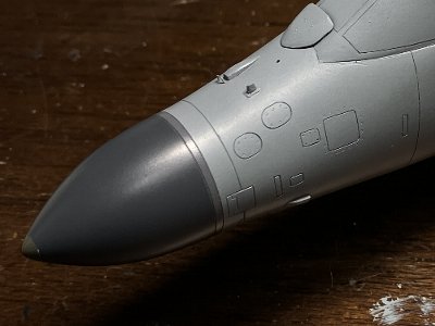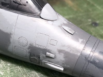 その他、垂直尾翼上端トリムの黒、尾部センサーの黒なども塗装。後者は筆塗り。前ノズルは、ハリアーIIの場合は迷彩色で塗装されているが、シーハリアーだと無塗装が大多数で、その場合は茶色い。