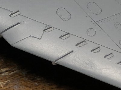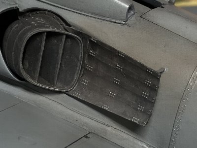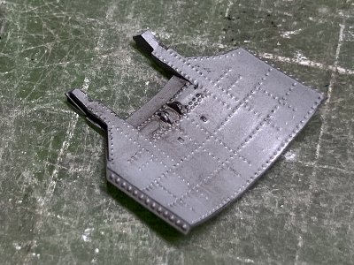 ![]() 左舷の遮熱板。断面形のカーブは上の方が半径が小さい。これも実機どおりに再現できる。リベットは6本パックを作って並べる。 |
