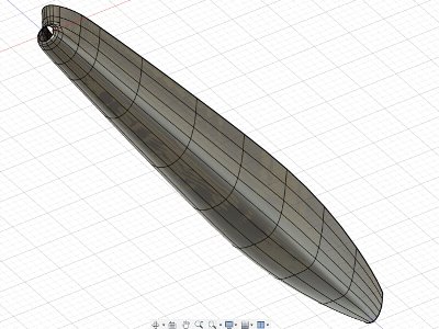 キットパーツは、悪くないが、5つあるバルジが3つしか再現されず、偏芯しているべき下面バルジはセンターにある。また、4つ並んだマズルの排熱穴は抜きの都合で再現されないが、これ手作業ではきれいに揃わない。省略されている4時8時方向のバルジは、峰にパネルラインがあって、「こんなの彫れるかバーロー」。だから3Dなのだ。 まず図面を作る。手持ちのAV-8A製造図に、このガンポッドの側面図、断面図があるので、これをトレースする。胴体との位置関係も示されており、銃口の中心が、胴体基準線から下に39.145"、横に19.38"離れている。ガンポッドの基本形状は前半3/4まで左右対称で、その対称面は垂直から15°傾いている。 これらを図化したら、Fusionに取り込んで設計する。別途、胴体断面図(これもベースは製造図だ)から胴体を作り、ガンポッドと胴体との位置を正しく合わせてから、ガンポッドを切り取る。キットの胴体形状は図面的に正確だから、これでキットとの合わせもバッチリなはずだ。 |