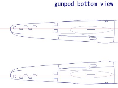 3D設計ができたら、そのレンダー画像をInkscapeに取り込んでガンポッドの図面を描き、従前の図面に追加する。胴体側面図には、15°傾いたガンポッドの座標空間で描いたガンポッドの側面、平面、正面図を加える。胴体左舷および下面図には、傾いた状態の図(つまり機体に取り付けられたもの真横、真下から見た状態)を加える。 その他補足。フォームで作ったボディーにソリッドのバルジを結合して、おまけにフィレットまで入れるのは、フュージョン君的にはかなり無理筋。だから、その表面にスケッチを投影してパスを作り、そのパスでパイプを作ったり、リベットを並べたりすると、彼の機嫌を損ねて履歴管理機能が上手く働かない。タイムラインを遡って修正すると、以後のパイプやパターンでエラーが出る。面倒くさいが、その都度修正・新規やり直しが必要となる。 リベットラインは、参照した現存機によってバリエーションがある。3Dモデルはそれらを適当に複合させたもの。ま、雰囲気ってことで。胴体との合わせは、バッチリな「はず」だが、やはり削り合わせは必要となる。モデルは接合面に0.1mmのマージンを設けてある。ガンポッドはFRS.1のみならず、他の第一世代ハリアーに共通。ご利用されたし。