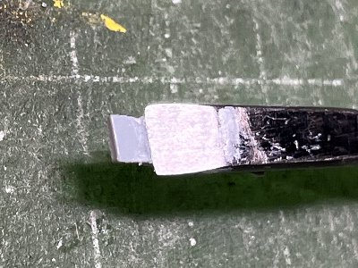 ![]() 切り出して、スジボリして、磨いて、ディテールを加え、セロテープでマスクしたところ。 |