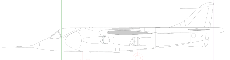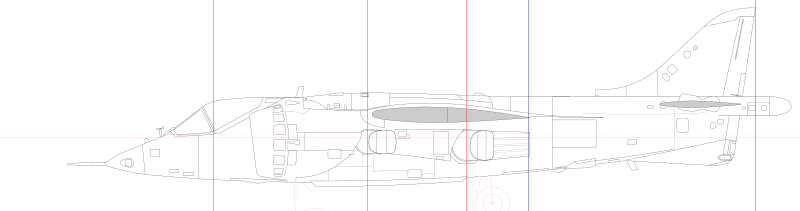 ![]() シーハリアーの図面に、写真と製造図から機首と尾翼の外形を描き加えたもの。したがって、外形はばっちりだ。細部の考証は甘いので悪しからず。 |