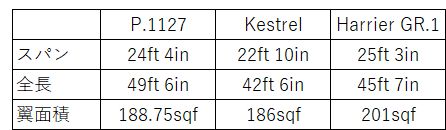 まずは、寸法。文献(ウォーペイント本)によると3者の諸元はこうなっている。確かにケストレルはハリアーより小さい。全体に一回り小さいのかな? |