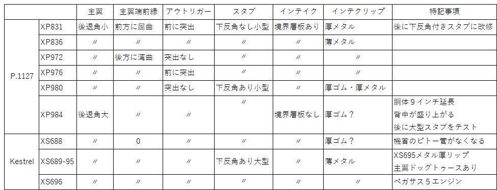 この表は、写真や文献で確認できたものを記載しているので、時期によってはこれと違う外形をしている可能性がある。とくにインテイクリップは各種の形をテストしていたので、時期によっても違いがあるはず。 もう一つ。シーハリアーの図面で、製造図面での仮想主翼前縁と実際の前縁の位置が違う、と書いた。おそらく、ケストレル(それも当初のドッグトゥースなし)の主翼前縁ラインがこのラインではないだろうか。