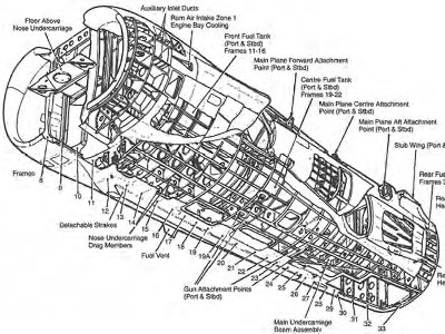 むむむ、正解はどこに? ということで、p.1127、ケストレル、ハリアーの写真を並べて比べ、フレーム図ともニラメッコ。私の結論は、確証はないが、ケストレルでは、後方ノズルの後方の27フレームの後ろにフレームを追加して9インチ延長。単純にプラグを挟むと、FA2のようなクビレが生じるが、なんか上手く処理したのだろう。 ハリアーでは、インテイクの断面拡大に伴い、コクピット後方バルクヘッドから33フレームの間で全面的に胴体が改設計されたと思われる。フレーム配置も異なる。しかし、フレームの数は同じなので、19Aという番号を新たにあてはめたのではないか(なぜ19という疑問は残る)。<この段落3/13訂正>