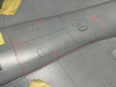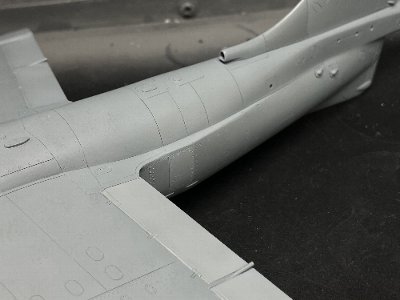 その他、ラダートリムタブの操作ロッドとか、アウトリガー前方のフェンスとか、ちまちまと追加。もう一度、スジボリの脱線やキズなどを修正し、サフを吹き、いよいよ機体塗装だ。