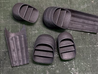 ![]() 補強板の浮き出しモールドは、これまたややこしい形だ。こういうのは、カッティングマシンしか勝たん。 |