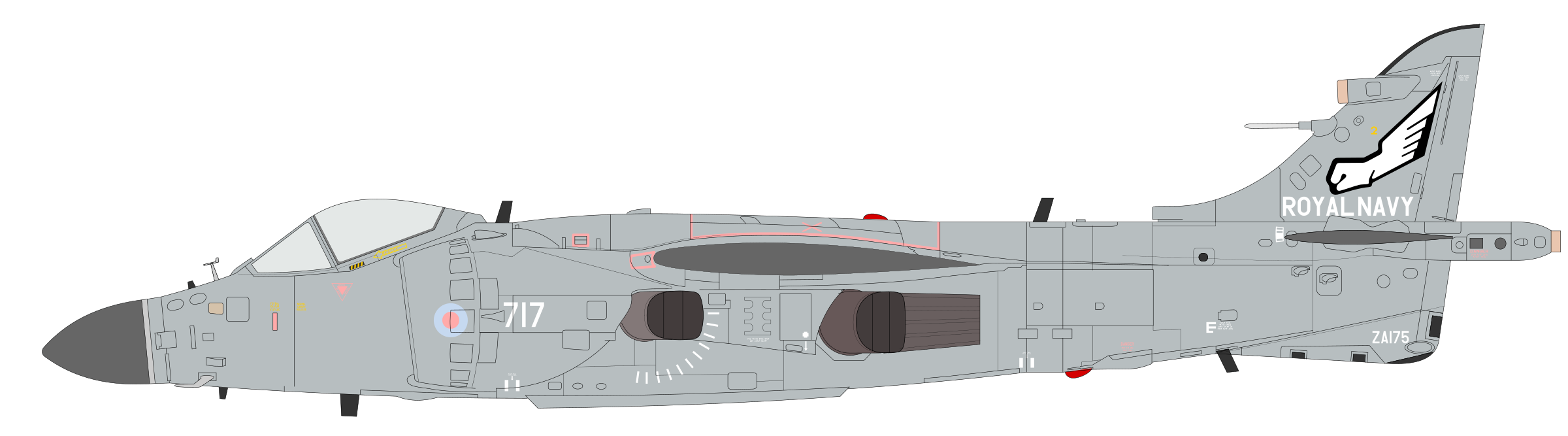 機首の基本形は同じ。後部胴体と垂直尾翼も同じ。胴体が短くなり、主脚と後方ノズルの位置関係が異なる。前脚位置も少し前かな。インテイクの形が異なり、境界層板がある。胴体中央部では、ノズルとそのフェアリングはケストレルとよく似ている。初期の機体は後方ノズルの遮熱板のところが全く異なる。主翼部分の胴体背中の盛り上がりがない。スタブは小さく、下反角がない。 主翼の形はまったく違う。後退角は小さくなり、後縁の後退角がゼロ(かほぼゼロ。真下の写真がないので厳密なところは不明)。主翼前縁は機体により、翼端が前方に折れ曲がるのと、ハリアーのように後方に湾曲するものとある。アウトリガーの先端が突出しているものもある。スパン(=アウトリガーの位置)はケストレルよりやや広い。結果として翼面積も大きい。下反角は同じかな。 |