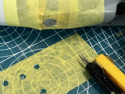 ![]() ラウンデルのブルーをマスキング。胴体は補助インテイクにかかるので、ややこしい。手前はピンク用の円で直径3.2mm。 |