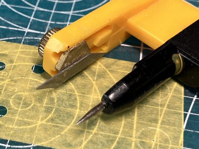 ![]() オルファのサークルカッターを改造して小さい円を切れるようにしている。うまく調整すれば直径2.5mmまで切れる。 |