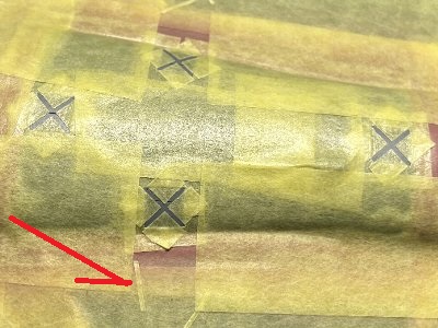 ![]() マスキング終了。×の線は先に細切りテープ(赤矢印)を貼ってこれをガイドとする。 |