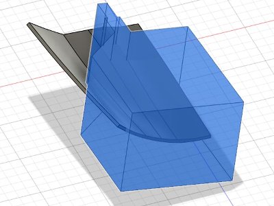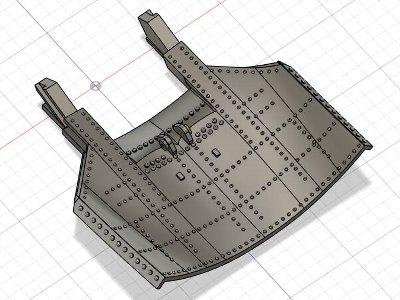さて、エアブレーキ。キットパーツも形はよい(AV-8Aのは大きいので、後端をカットする必要がある)。しかし、内側の凸リベットを再現するなら3DPがラクだ。胴体断面図、側面図、平面図が出来ているから、それをfusion360に取り込み、そのとおりに再現すれば、正確なものが出来る。 |