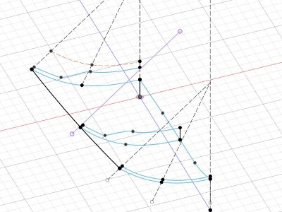 補足。フォームモードのブリッジでは、つなぐ辺の数を揃える必要がある。あらかじめそれを考慮してロフトの際に面の数を指定するべし。つなげた直後はエッジが丸いので、「修正→折り目」でエッジを立てる。前後端は辺の数が違うのでフォームでは塞げない。そこはサーフェスモードで塞げばよい。 ロフトした形状は完璧に正確でなくともよい。そこは各点(辺、面)の位置を微調整して整える。一方で厳密に正確にしたい箇所(今回でいえば、外面の断面形と側面形)は、スケッチどおりドンピシャに再現させることも可能。これがフォームのロフトの最大のメリットだ。 平面形で交差する際、平面図をトレースしたスケッチを垂直方向に押し出すと、アーム部分の断面形が平行四辺形になってしまう。それを避けたいので、斜めに押し出したい。でも図面は水平面に描かれている。こういうときは、平面図のスケッチをサーフェスに投影し、その図形を斜めの面に再度投影。それを押し出せばよい。上画像で青いボディが斜めに押し出されているのがわかるかな?
