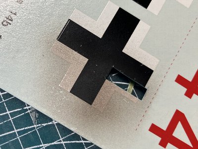 ![]() 赤線を先に塗装し、×をマスキング中の図。まず位置決め(右、上)、次に四隅を決め(下)、四角をはがして十字(左)。 |